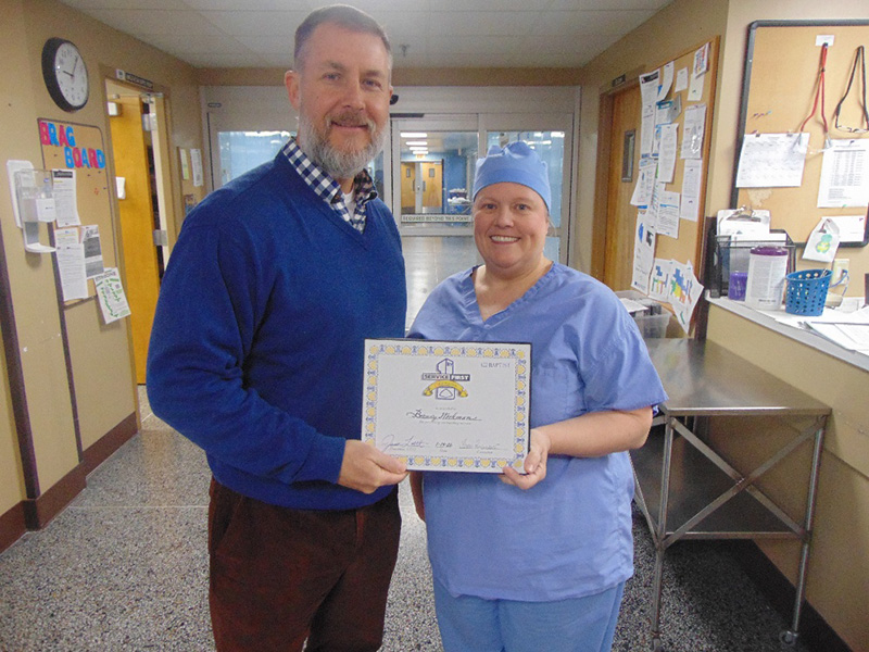 Brandy Workman, a licensed practical nurse in the Operating Room, became a Service First Champion for her compassion and dedication. The nominator praised Workman for volunteering to assist a patient’s wife when her husband couldn’t be revived. She had mobility issues, and Workman provided a wheelchair, ensured safe transportation to the waiting room and provided emotional support. “Brandy remained with the patient’s wife after the news was delivered that no family ever wants to hear. Brandy’s kindhearted and caring actions will never be forgotten,” said the nominator.