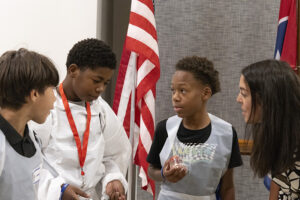 Students speaking with Kayla Rodriguez Graff (far right) at Family STEM Night and SHE Leads the Way