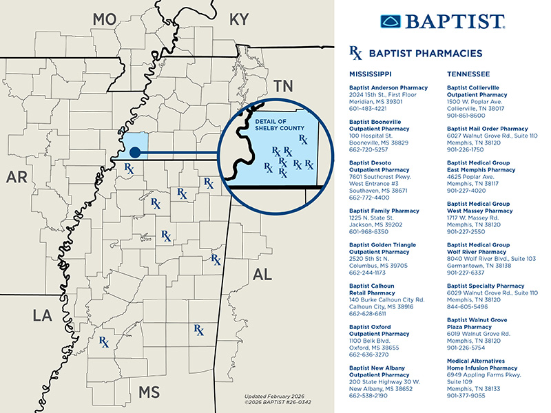 Yes. Our Baptist outpatient pharmacy hospital locations include Baptist Anderson Regional Medical Center, Baptist Booneville, Baptist Calhoun, Baptist Collierville, Baptist DeSoto, Baptist Golden Triangle, Baptist Memphis, Baptist North Mississippi, Baptist Union County and Mississippi Baptist Medical Center.