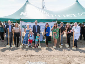 From left, NEA Baptist Administrator and CEO Sam Lynd, Rhonda Meeks, Alyssa Burks and Dr. Jared Burks with their children Zeke and Clay Burks, Melanie Edens, Andrea Simpson, Rob Hester, Advanced Practice Nurse Danna Deaton and NEA Baptist Chief Medical Officer Dr. Stephen Woodruff.